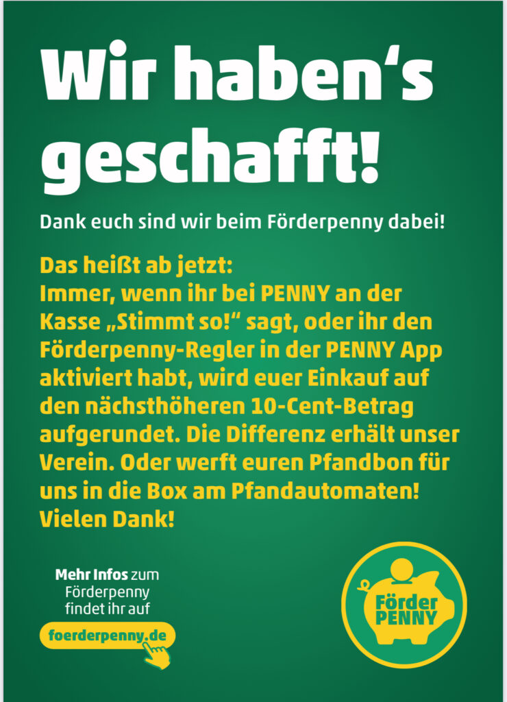 Wir nehmen an der Förderpenny-Aktion teil – und das bedeutet: Jedes Mal, wenn ihr euren Pfandbon oder euren Penny-Spendenbetrag an der Kasse spendet, helft ihr direkt unserem Verein.