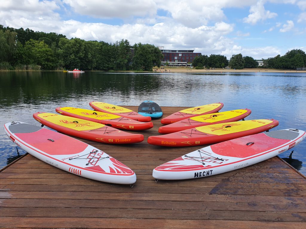 Bei uns kannst du nach einer 2-stündigen Ausbildung mit unseren vereinseigenen Boards alleine auf dem Allersee in See stechen.